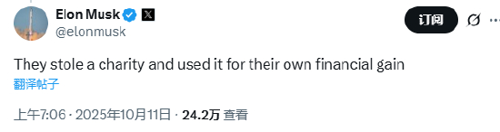 北京时间10月11日早间消息,马斯克在X表示,OpeAI建立在谎言之上的,他们“窃取了慈善机构的资金并将其用于自己的经济利益”。有网友称“它不应该是个非营利组织吗?”马斯克则用“100分”表情包表示赞同。
